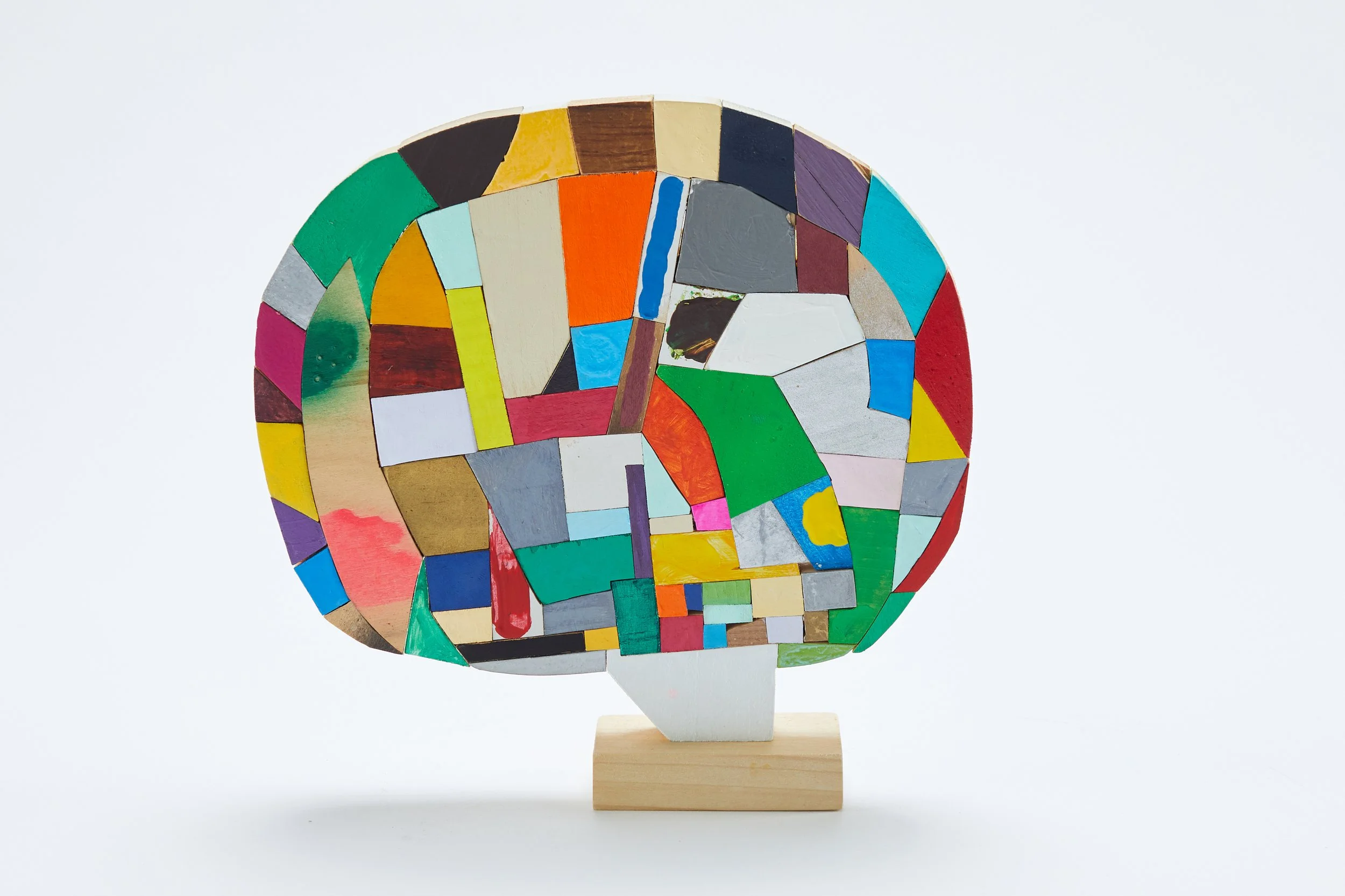 Face 9" x 9" x 2" wood, acrylic, spray paint, oil, ink, glue 2018